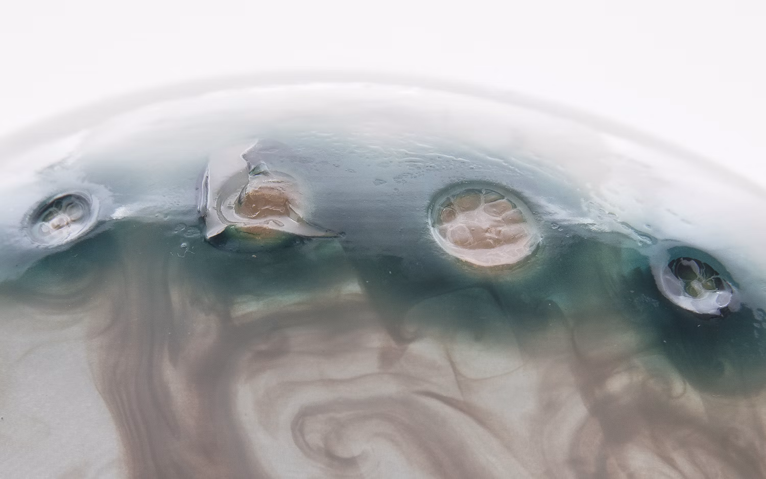 Devoid of cultural expressions and initially nearly colorless, these masks are paradoxically the most ‘alive’ of the three series. They literally ‘re-engineer’ life by guiding living microorganisms using spatial features from the artifacts of the dead. The microorganisms' protein expressions are distributed according to the spatial logic provided by the second series.