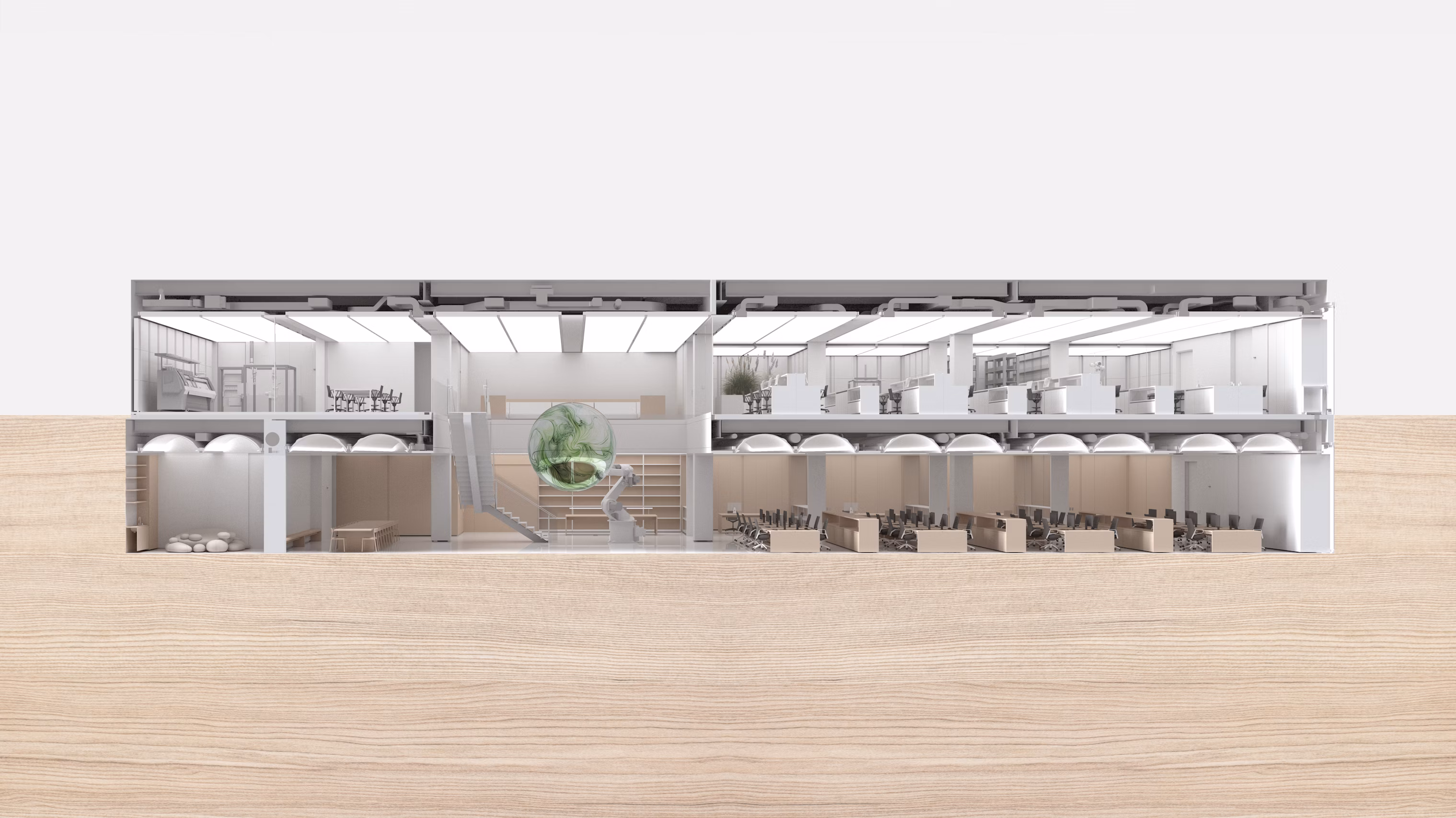 Designed in collaboration with Foster + Partners, the space integrates cutting-edge architectural technologies. Custom furniture and advanced lab equipment redefine the possibilities for a multifunctional studio, lab, and workshop.