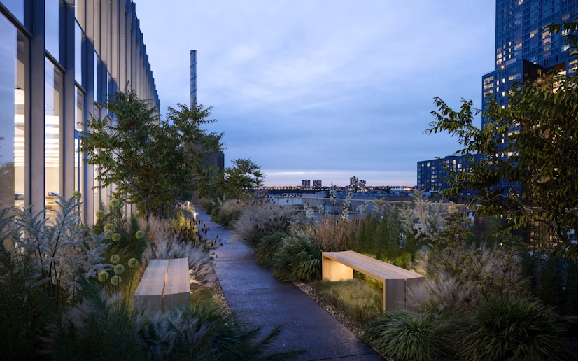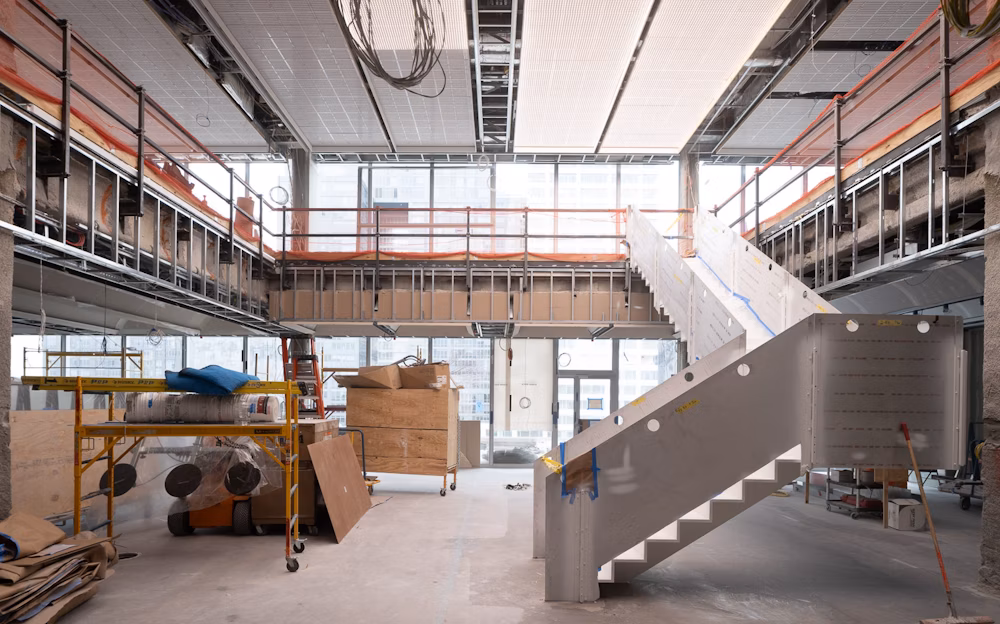 The design studio on the 9th floor offers a dynamic and adaptable space that balances focus and energy. An open workspace connects private offices, meeting rooms, a library, and a gallery system displaying rotating selections from the physical archive. The heart of the studio is a 912 square-foot double-height prototyping and exhibition area, designed to accommodate structures up to 25 feet tall, emphasizing the studio’s commitment to hands-on experimentation and large-scale design.
