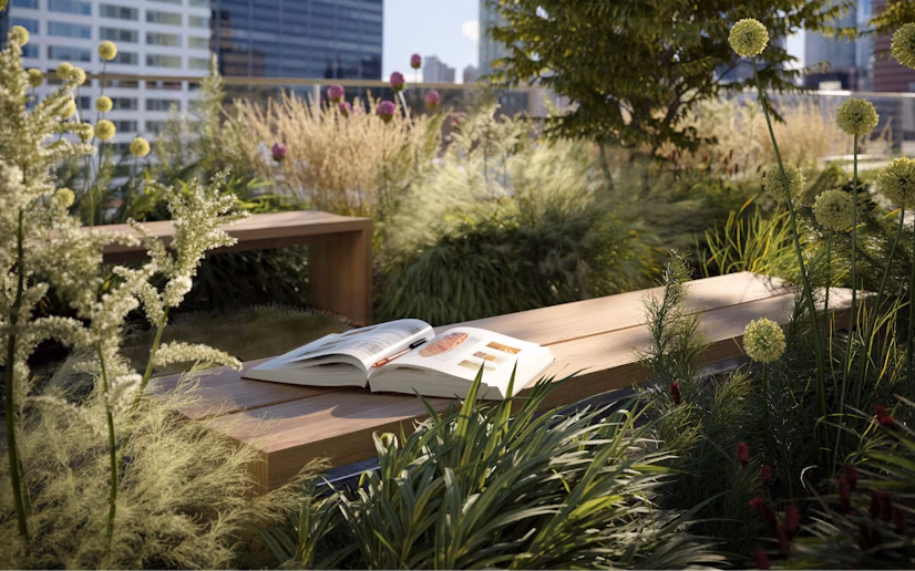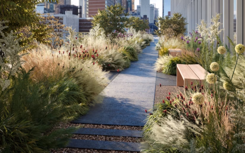The garden has been designed to create niches for respite and conversation while the programming serves to maximize biodiversity in a minimal footprint. Featuring 25 different species of plants covering 65% of the total area, it is designed around native pollinators and species to serve as a thriving habitat.