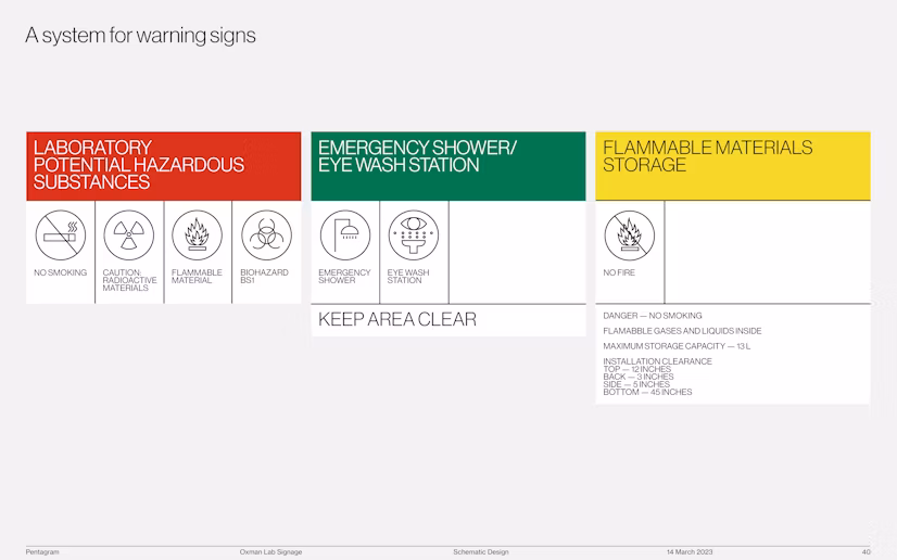 Safety signage, personal protective equipment, and other lab elements were customized using the OXMAN graphical language, while fully adhering to code compliance. This approach ensures a cohesive aesthetic without compromising safety standards.